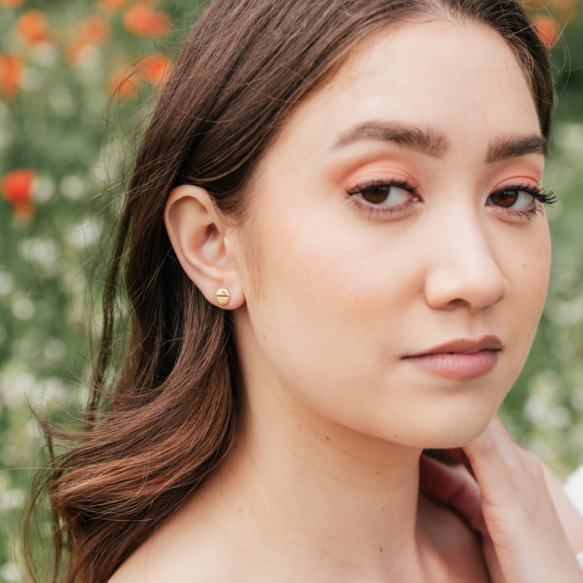 The tiniest gold horizon sun stud earrings to add to your ear stack. These cute carved circles sit perfectly on the ear lobe. Hypoallergenic, nickel-free and great for sensitive ears.