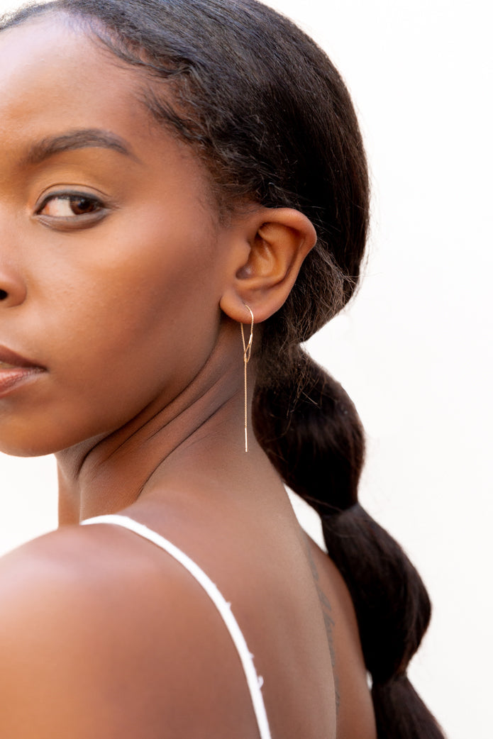 This threader is so light and delicate, it can be worn so many different ways. It looks just like a threaded needle, but, its actually delicate, thin chain. Loop it through the eye of the needle or sew it through multiple ear holes, the possibilities of how to wear it are endless.