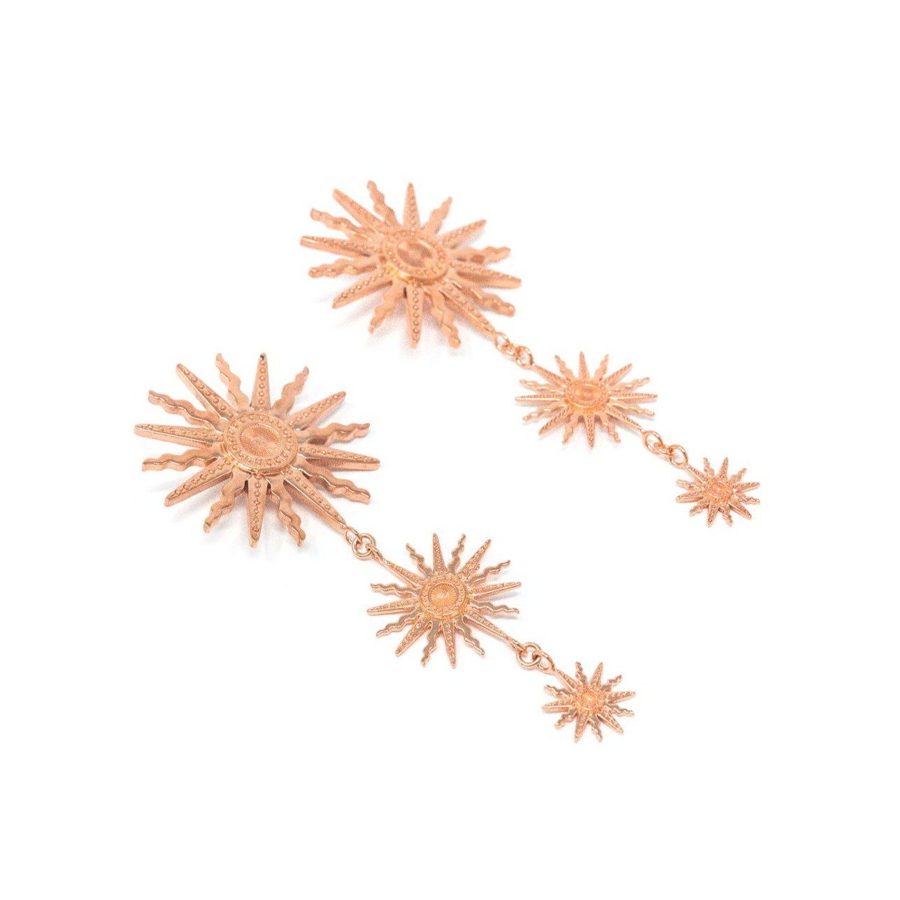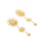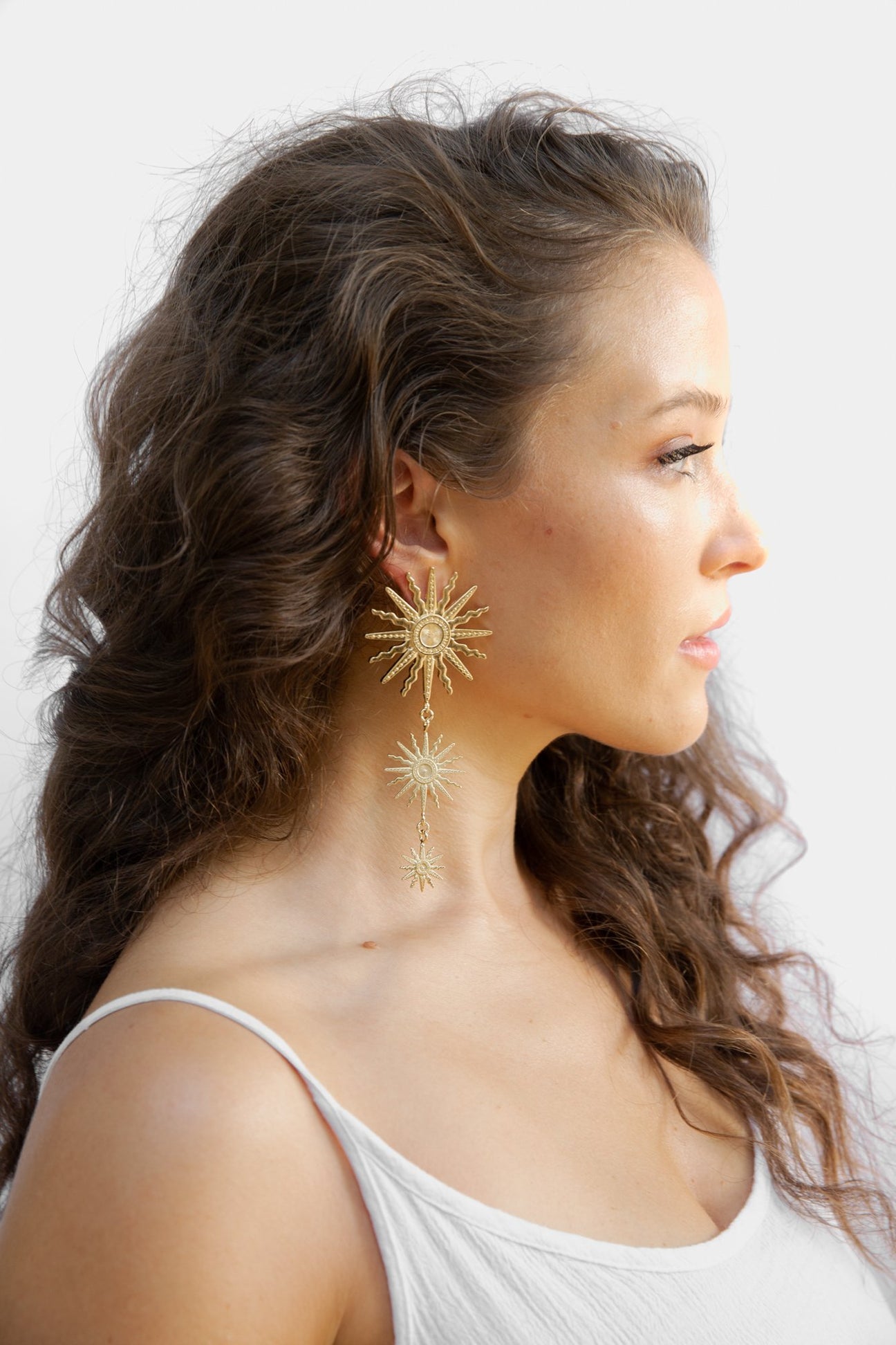 This is a truly special piece. The three interlocking sun designs sit on the earlobe comfortably and even though this is a large statement earring, it is still not heavy at all. The earring measures at 4.5 inches.