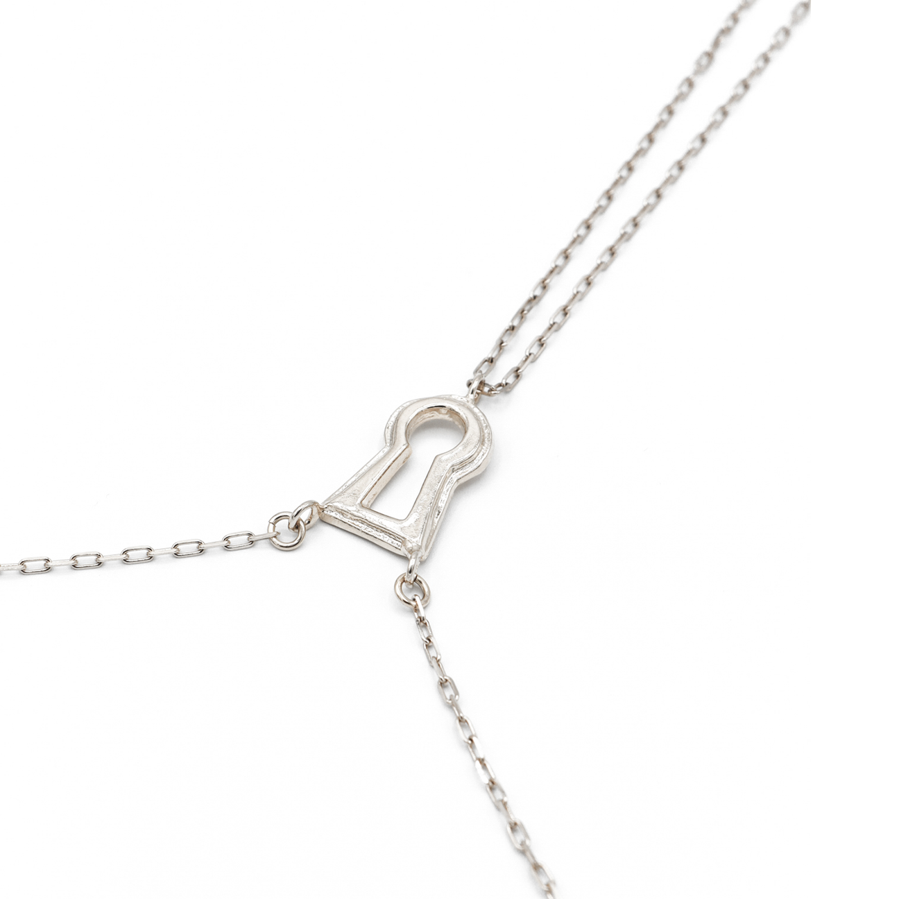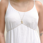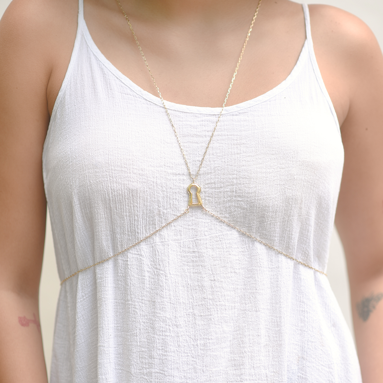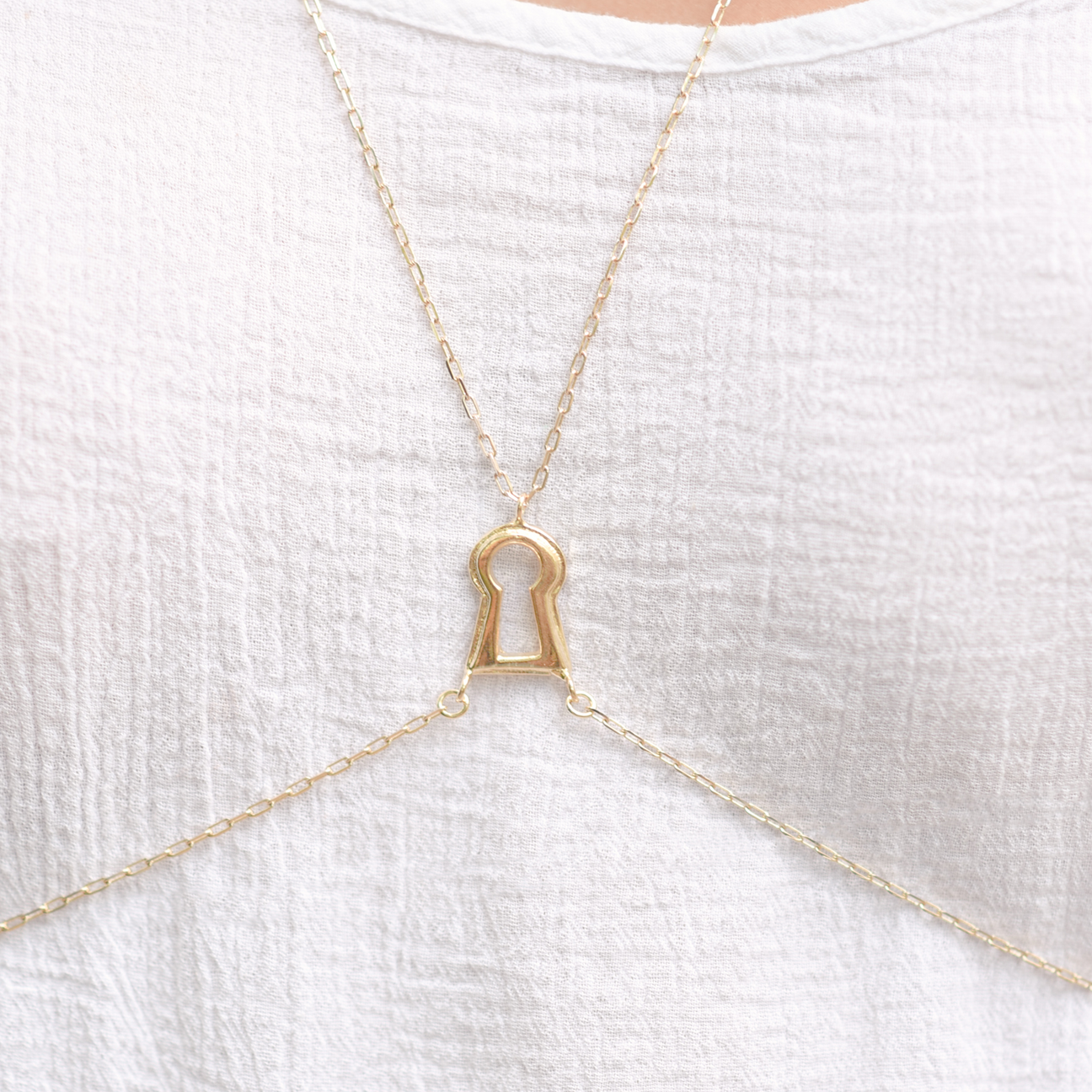 This body chain looks great on top of your clothes, with a swimsuit or under a bralette. It’s so versatile. The keyhole dangles perfectly on a beautiful handmade link chain which can be easily attached with a lobster clasps in back. The Vessel body features an open keyhole nestled at the center of the chest that was cast from a vintage doorway in France.